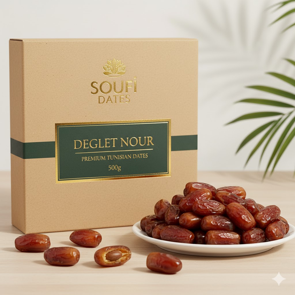 Our premium Deglet Nour dates represent the pinnacle of Tunisian date cultivation. Translucent, delicate, and with an incomparable sweetness, they are the jewel of our collection.